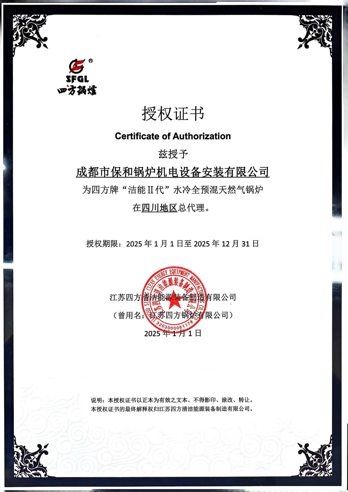 四方牌“洁能Ⅱ代”水冷全预混天然气锅炉代理授权证书